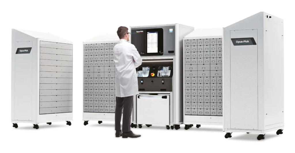 Opuspick es un sistema automatizado de preparación y distribución de medicamentos y materiales que digitaliza el flujo logístico desde la farmacia central hacia todo el hospital. Permite preparar bolsas de medicamentos por paciente, cargar dispensarios y abastecer unidades clínicas de forma rápida, ordenada y segura.