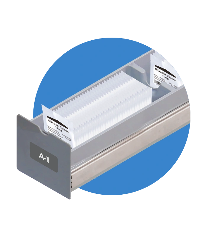 Controla cada medicamento entregado mediante apertura guiada de cajones e identificación directa en la bolsa.